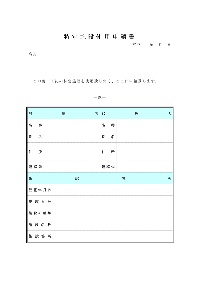 9,000원/월특정 시설 사용 신청서(일본어)입니다. 특정 시설 사용 신청서(일본어) 양식이 일본어로 작성된 문서양식입니다. 일반서식, 일반서식 분야에 활용할 수 있습니다. 특정 시설 사용 신청서(일본어) 양식