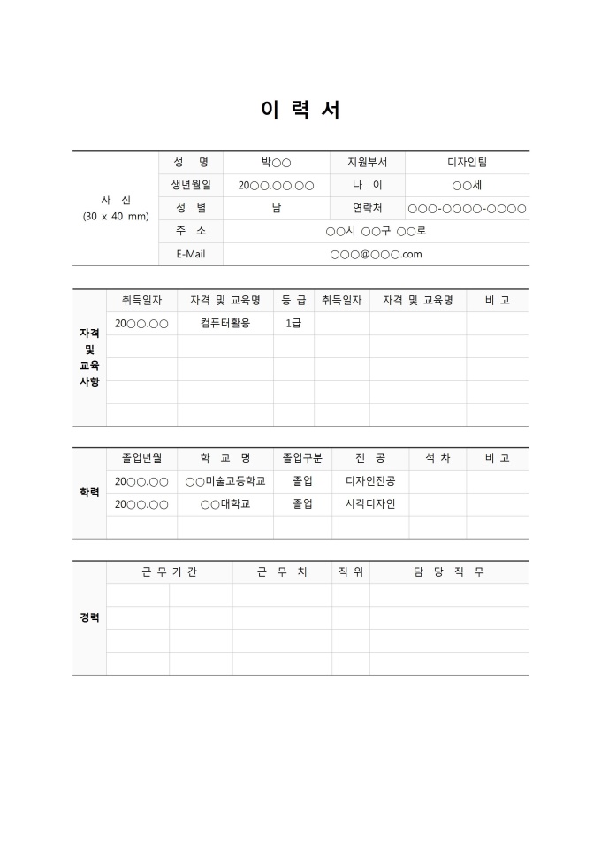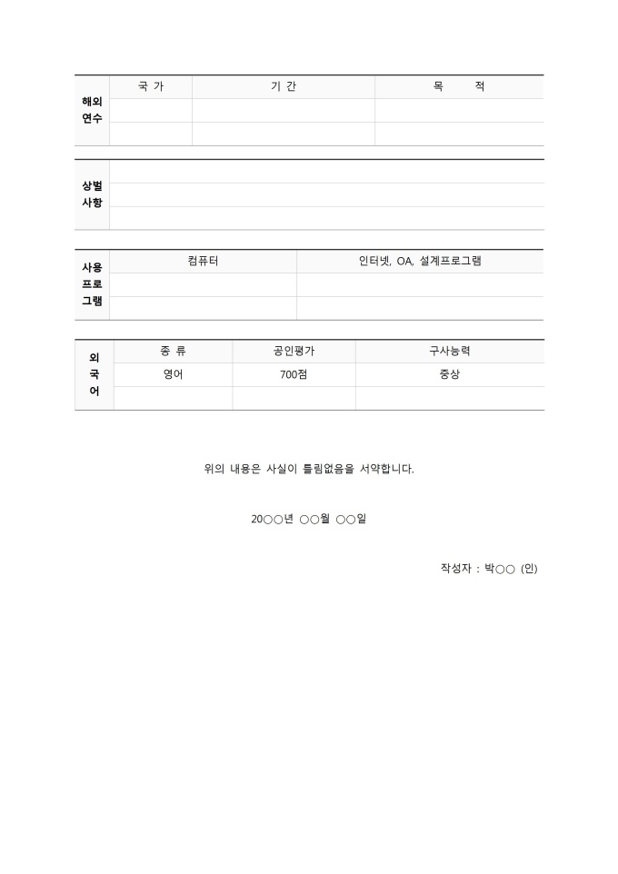 9,000원/월취업을 목적으로 자신의 정보를 기재해 회사 등에 보여주기 위해 제출할때 사용할 수 있는 문서입니다. 기존과 다른 2장형태의 이력서이며 인적사항, 신체사항, 자격 및 교육사항, 학력사항, 경력사항, 해외연수, 상벌사항, 사용프로그램, 외국어 등으로 구성되어 있습니다.