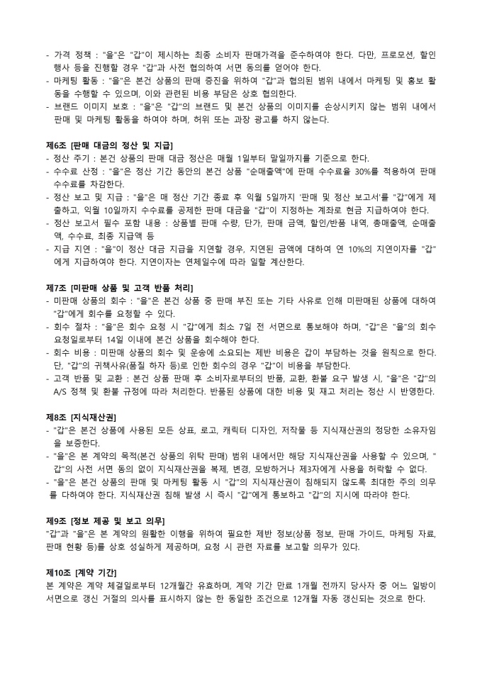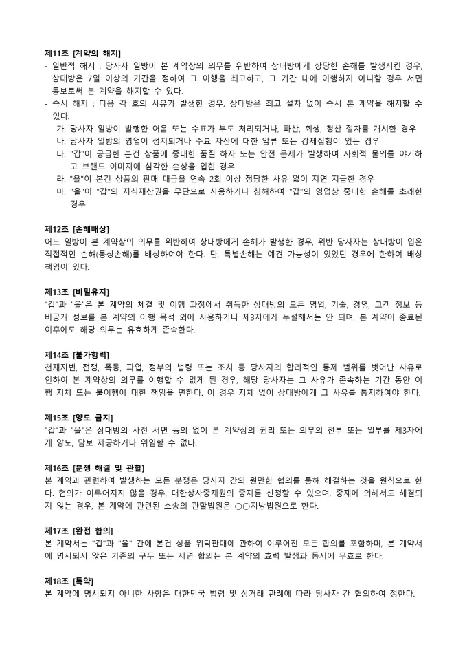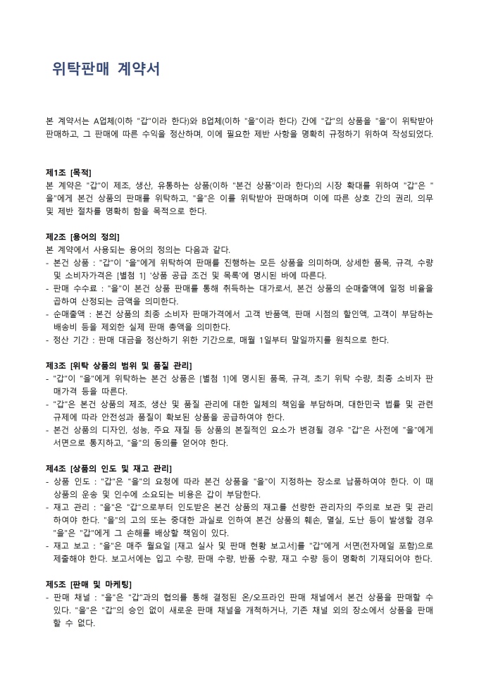 위탁판매 계약서 서식입니다. 위탁판매 계약서 서식은 위탁자와 수탁자 간의 위탁판매 관계를 명확히 규정하는 문서입니다. 이는 상품의 소유권은 위탁자에게 유지하면서 수탁자가 상품 판매를 대행하고, 판매된 수량에 대해 정산 및 수수료를 지급하는 내용을 포함합니다.