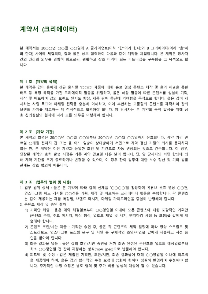 계약서 (크리에이터) 서식입니다. 계약서 (크리에이터) 서식은 창작자와 의뢰인 간의 협력 관계를 명확히 규정하고 상호 권리와 의무를 보호하기 위해 사용됩니다. 이는 콘텐츠 제작 범위, 지식재산권 소유 및 활용, 수익 배분 방식, 계약 기간 및 해지 조건 등 핵심 내용을 명시하여 분쟁을 예방합니다. 본 서식은 창작 활동의 법적 안정성을 확보하고 투명한 파트너십을 구축하는 데 필수적인 문서입니다.