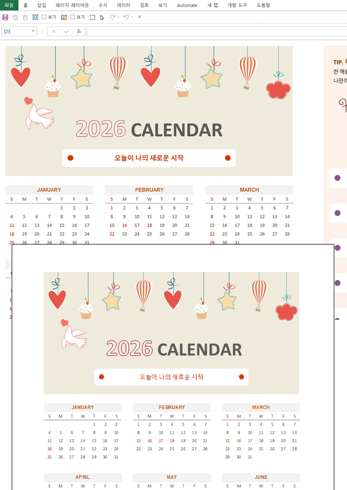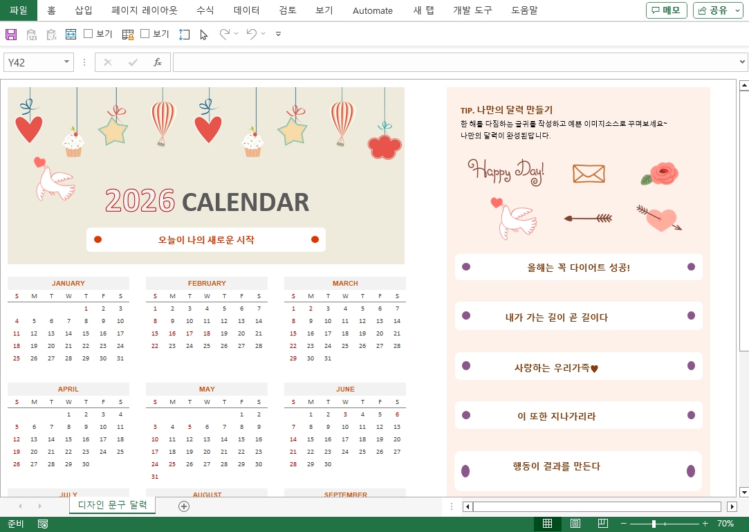 2026년 달력(연간일정,원페이지,디자인 문구) 서식입니다. 2026년 엑셀 달력 서식은 전체 연간 일정을 한 페이지에 보기 좋게 정리하여 효율적인 계획 수립을 도우며, 특별히 감성적인 디자인 문구들이 추가되어 사용자의 일상에 소소한 영감과 시각적인 즐거움을 선사합니다. 복잡한 기능 대신, 간결하면서도 심미적인 요소를 통해 일상 속 활력을 더해주는 특별한 달력 서식입니다.