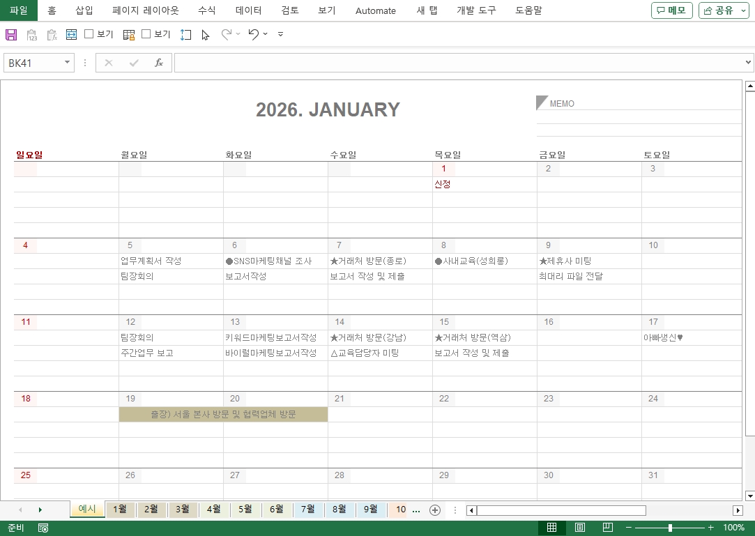 2026년 달력(월별일정,기념일,업무관리) 서식입니다. 2026년 엑셀 달력 서식은 월별 일정을 체계적으로 정리할 수 있도록 돕고, 중요한 기념일들을 쉽게 표시하여 개인적인 이벤트 관리를 용이하게 합니다. 이와 더불어 업무 관련 일정을 효율적으로 기록하고 추적할 수 있는 기능을 제공하여, 개인 생활과 직업 활동 모두에서 완벽한 균형과 관리를 지원합니다.