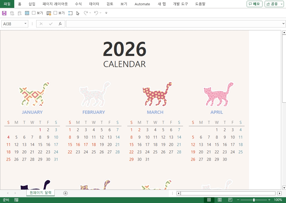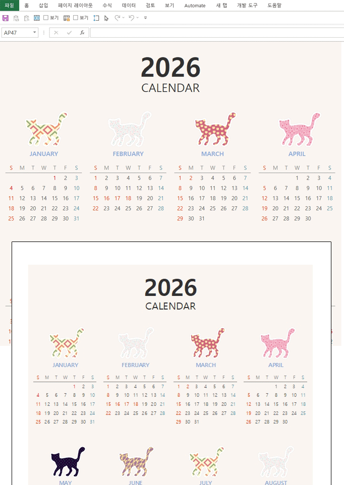 2026년 달력(연간일정,원페이지,귀여운고양이) 서식입니다. 2026년 엑셀 달력 서식은 전체 연간 일정을 한 페이지에 압축하여 효율적인 계획 수립을 돕습니다. 귀여운 고양이 이미지가 디자인 요소로 추가되어, 달력을 사용할 때마다 소소한 즐거움과 따뜻함을 선사합니다. 실용적인 일정 관리 기능과 더불어 보는 즐거움까지 겸비하여, 사용자의 일상에 활력과 행복을 더해주는 사랑스러운 달력 서식입니다.