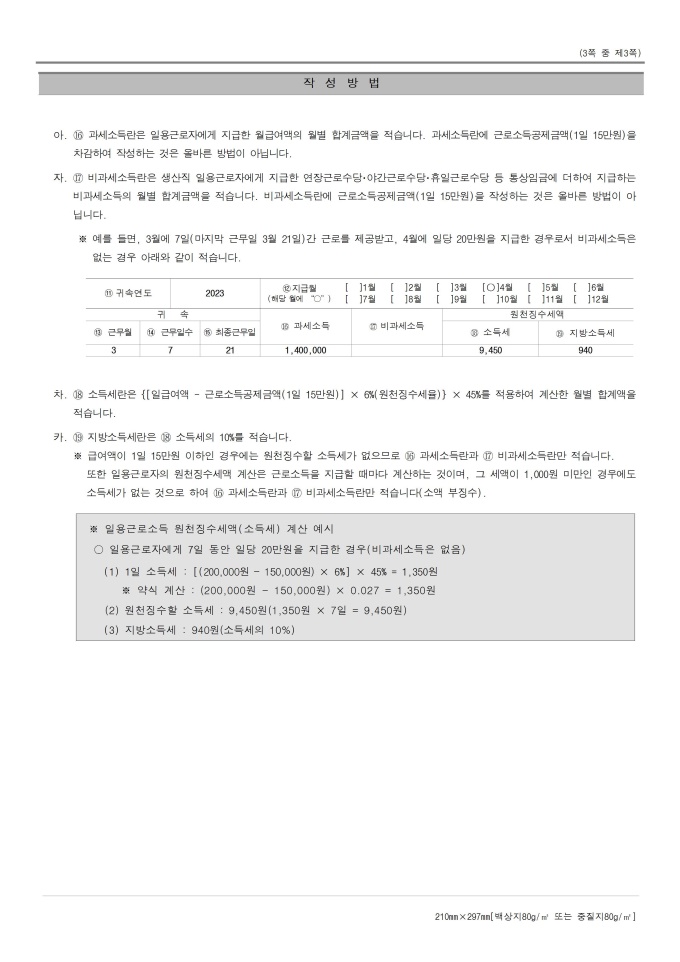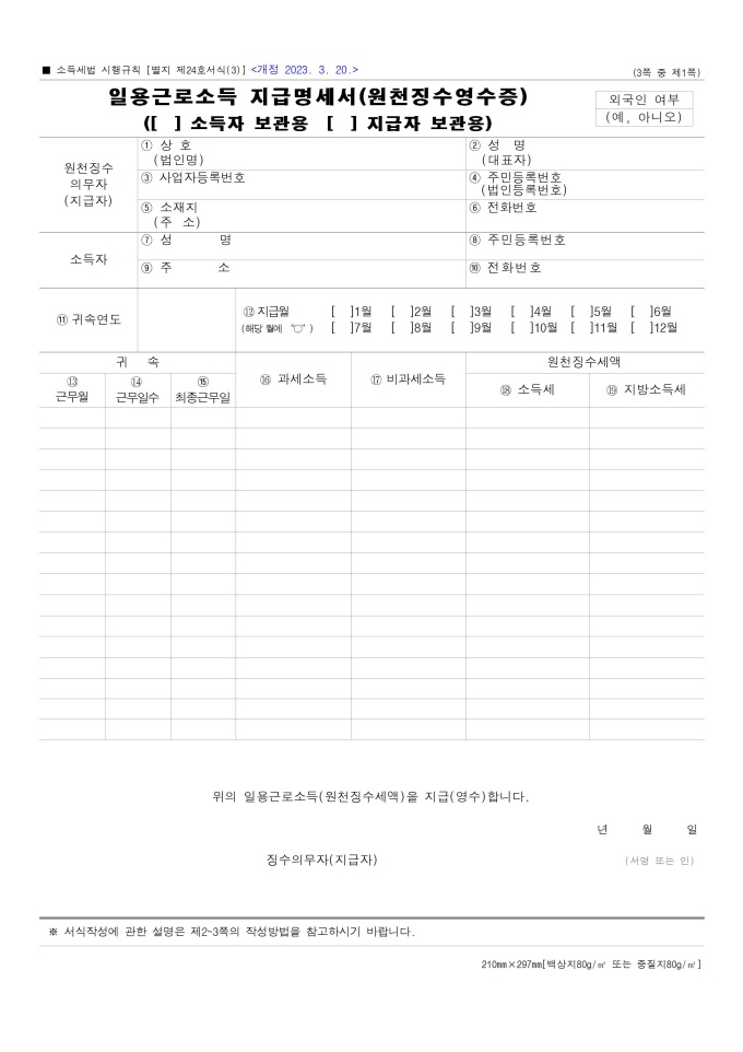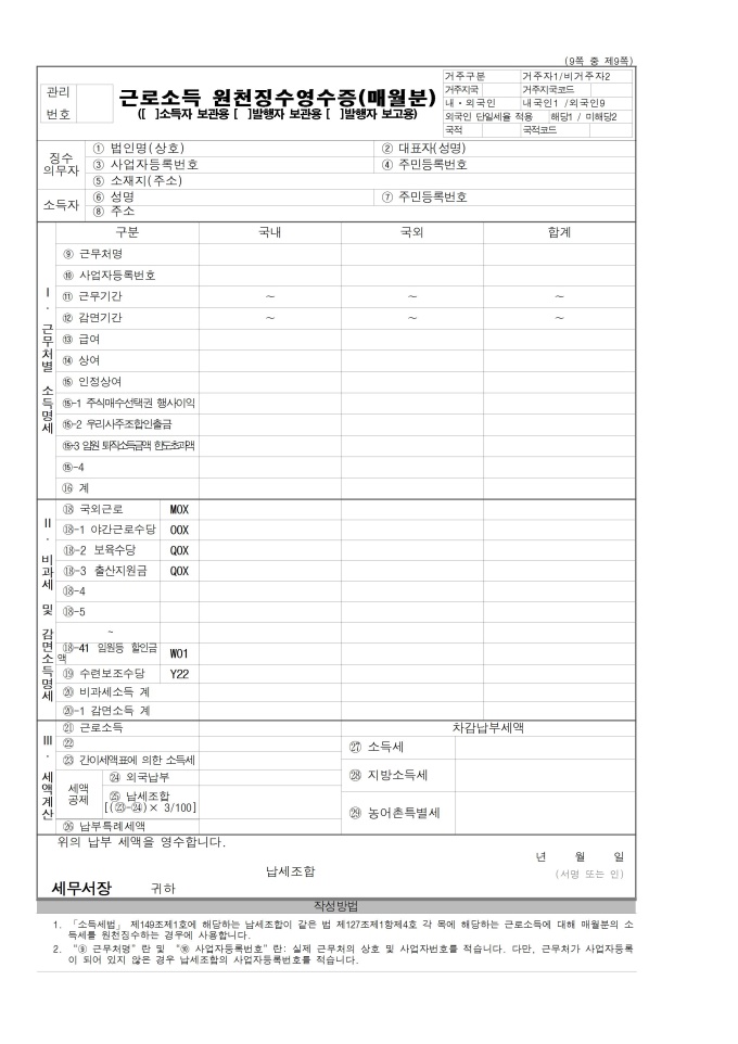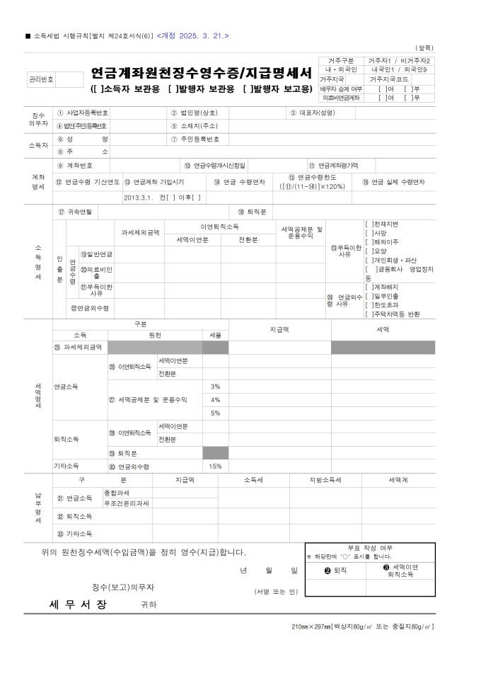 9,000원/월근로소득 원천징수영수증, 근로소득 지급명세서, 퇴직소득원천징수영수증_지급명세서, 일용근로소득 지급명세서(원천징수영수증), 일용근로소득 지급명세서, 연금소득 원천징수영수증(연말정산용), 연금소득 지급명세서(연말정산용) 서식입니다. 소득세법 시행규칙 [별지 제24호서식(1)] [개정 2025. 6. 30.]