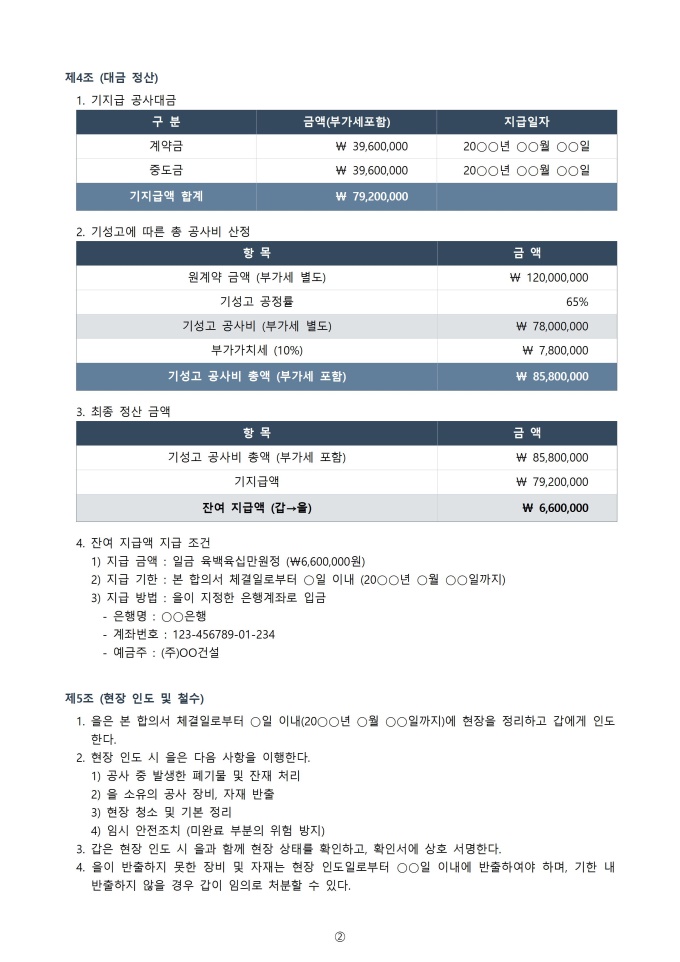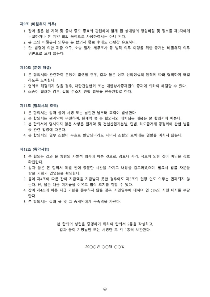 9,000원/월공사 타절 합의서 서식입니다. 공사 타절 합의서는 진행 중인 공사를 중단하기로 양측이 합의한 내용을 공식적으로 기록하는 문서입니다. 이 합의서에는 공사 중단의 사유, 중단 시점, 미완료 부분의 처리, 합의 당사자의 권리와 의무 등을 명확히 명시하여 분쟁을 예방하고 원만한 해결을 도모하는 역할을 합니다.