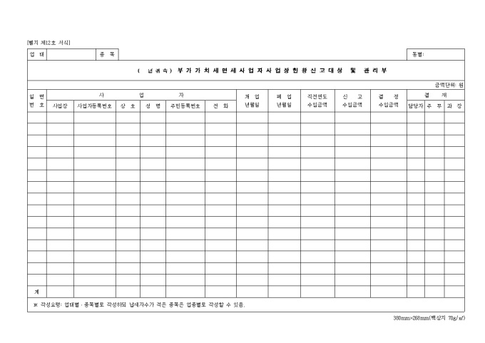 제12호 부가가치세면세사업자 사업장현황신고대상 및 관리부 ※ 작성요령: 업태별․종목별로 작성하되 납세자수가 적은 종목은 업종별로 작성할 수 있음.