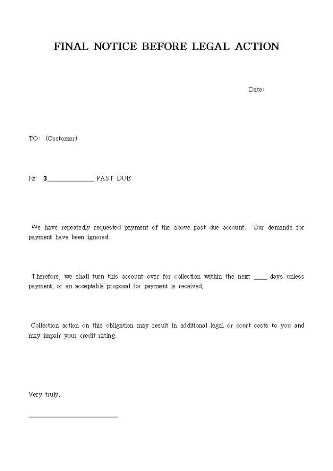 9,000원/월FINAL NOTICE BEFORE LEGAL ACTION입니다. 아래는 전체내용중 일부분입니다. We have repeatedly requested payment of the above past due account. Our demands for payment have been ignored. Therefore, we shall turn this account over for collection