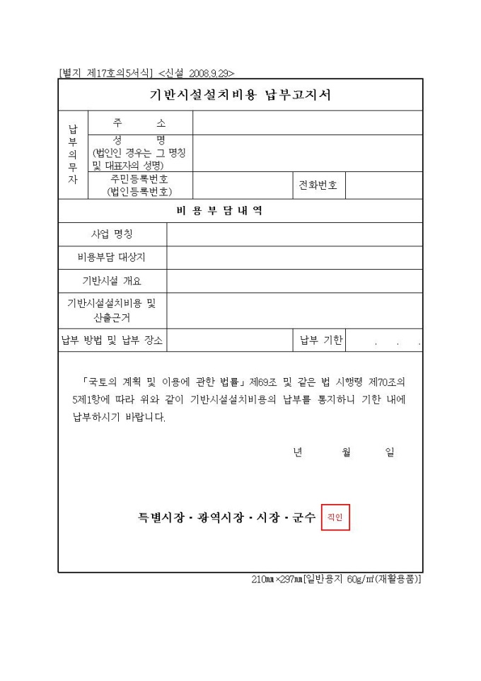 기반시설설치비용 납부고지서