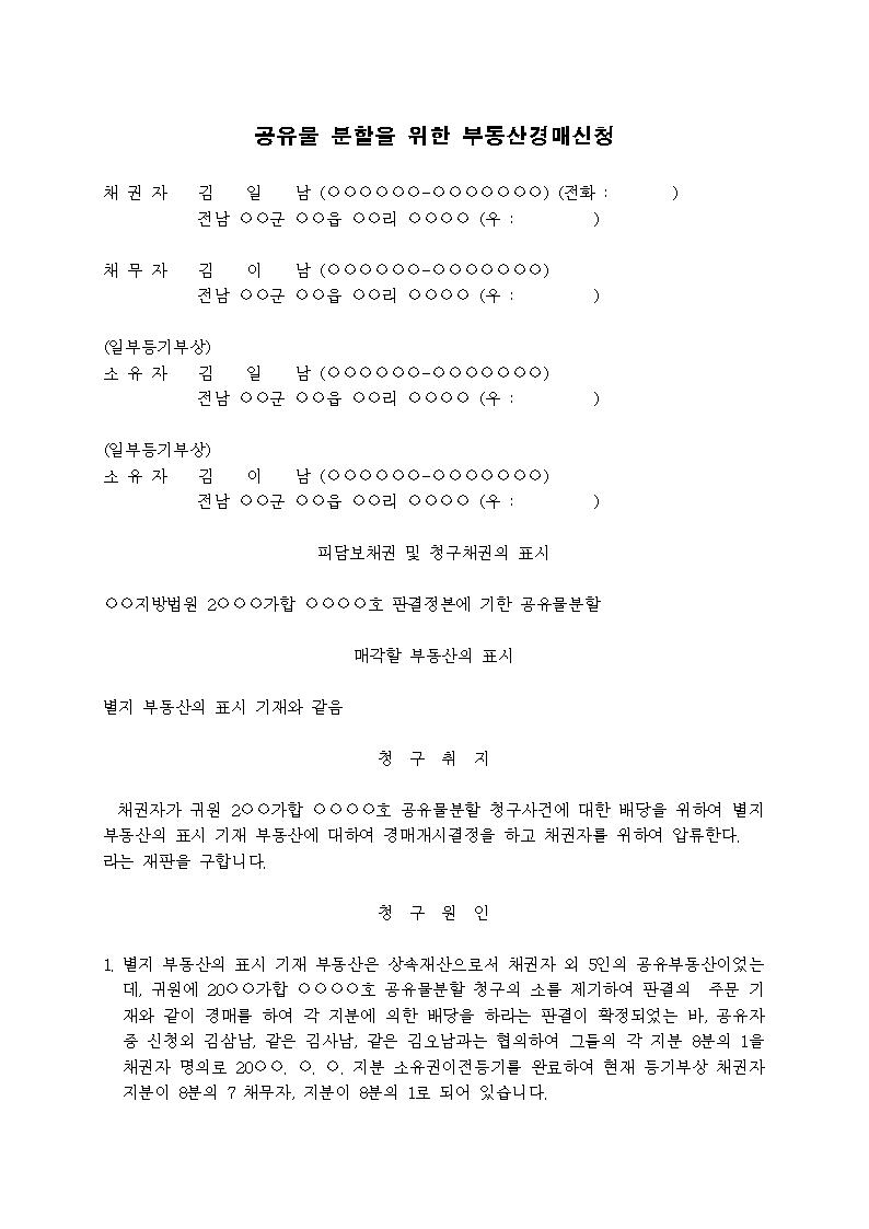 공유물 분할을 위한 부동산경매신청서(형식적 경매)